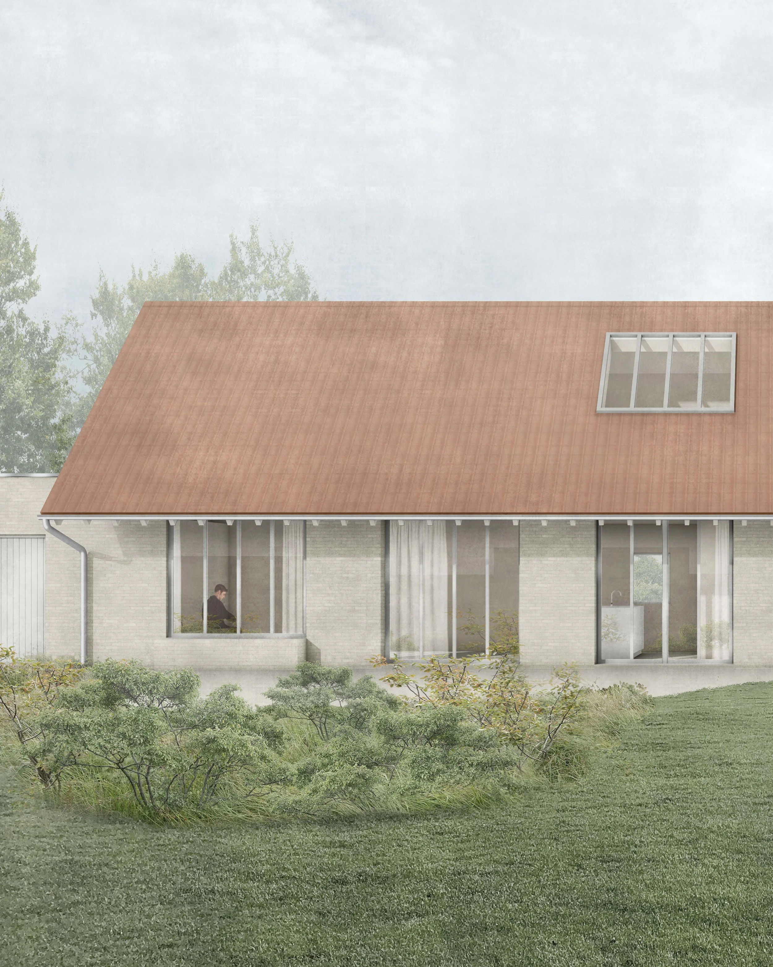 Een vervallen schuur naast de ouderlijke woning krijgt een nieuw leven als zorgwoning. De dochter woont hier straks, dicht bij haar ouders, om hen te ondersteunen wanneer de tijd daarom vraagt. Wat ooit een langgerekt volume was met willekeurig aangebrachte openingen, wordt omgevormd tot een helder en leesbaar geheel, zowel in plan als in gebruik en uitstraling.